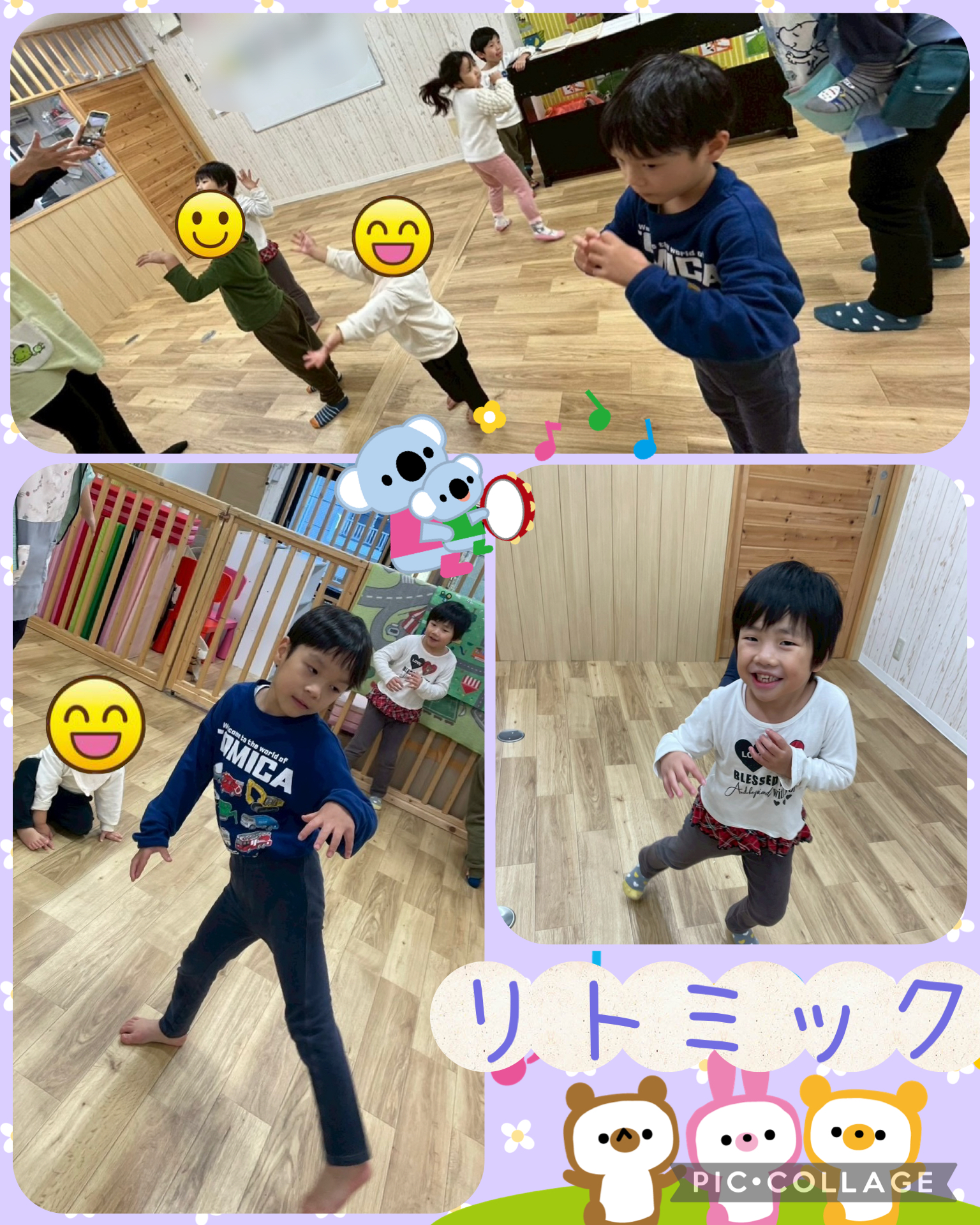 リトミックではピアノの音楽に合わせて動物のマネっこや腹式呼吸をしました♫