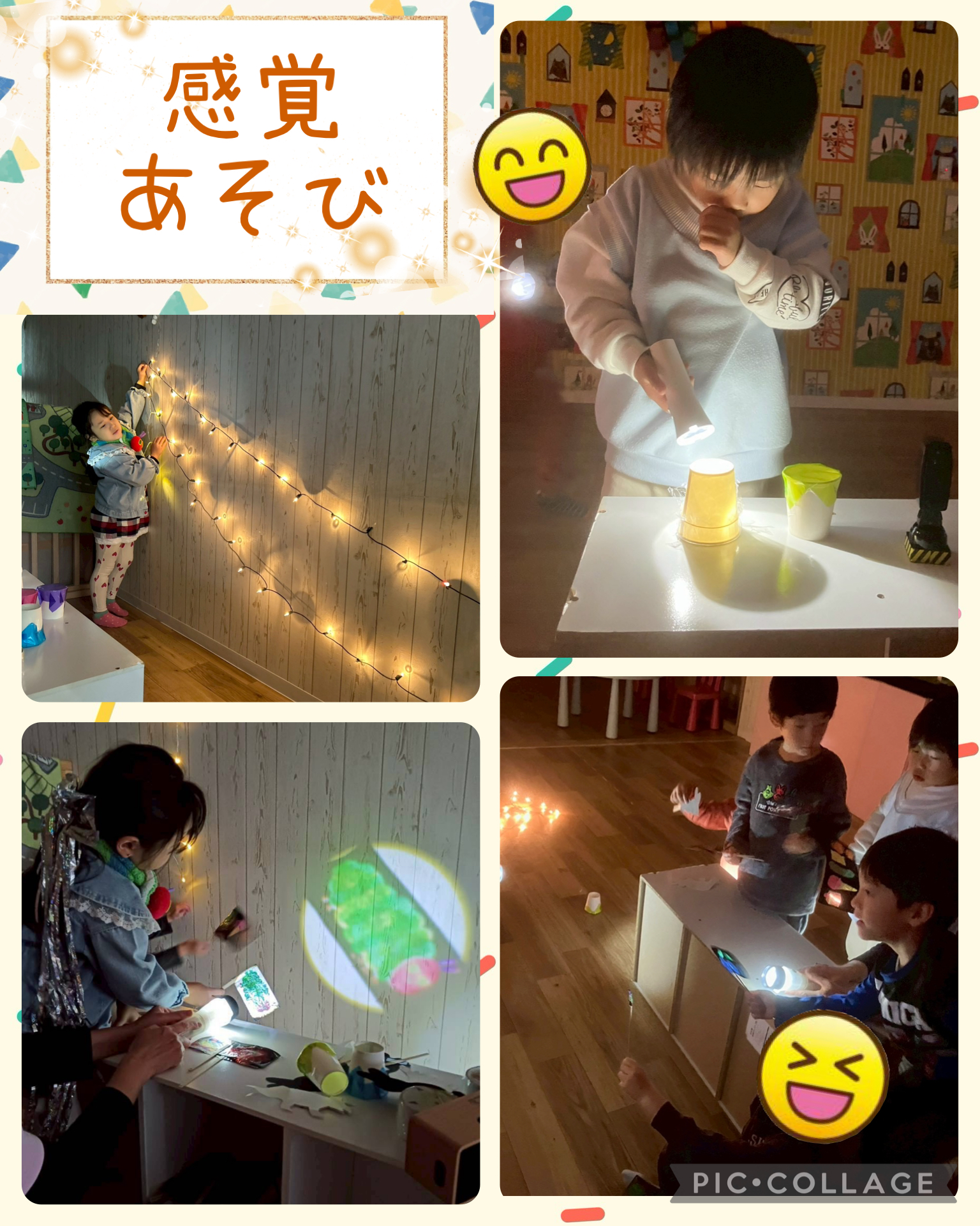部屋を暗くし、室内をライトで照らして目をキラキラさせる子どもたち✨