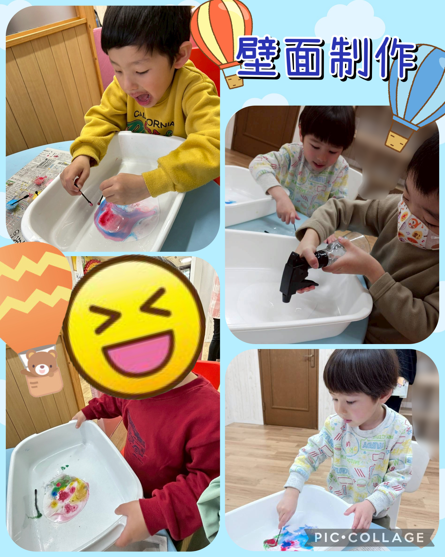 壁面製作では、にじみ絵で気球の風船の部分を作りました🎈