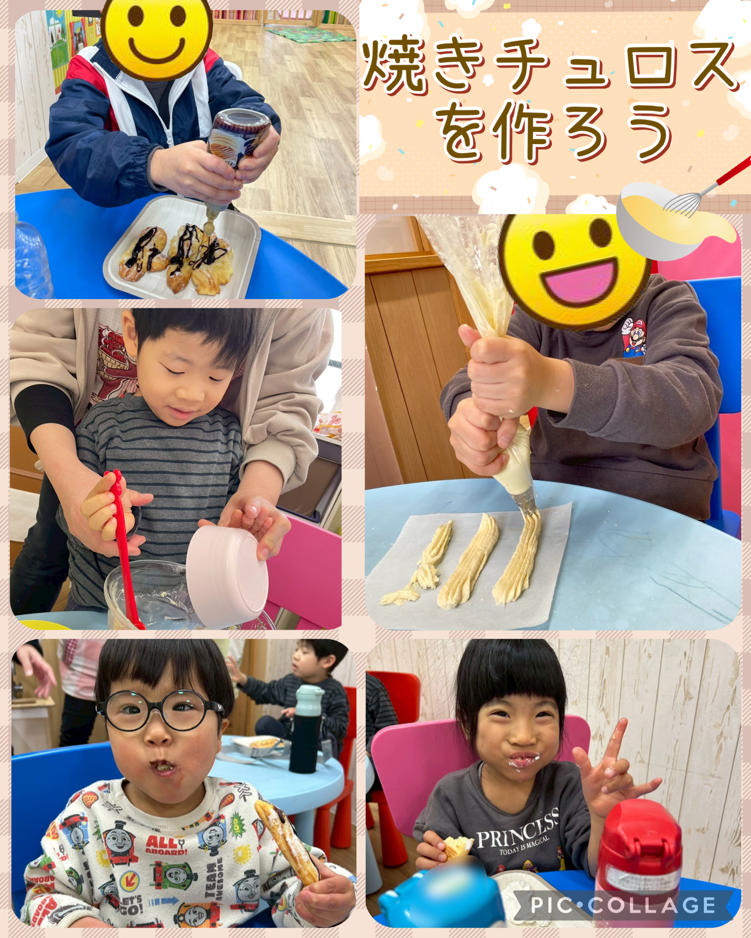 焼き上がったチュロスに生クリームやチョコソースをかけてみんなでおやつの時間に食べました♫