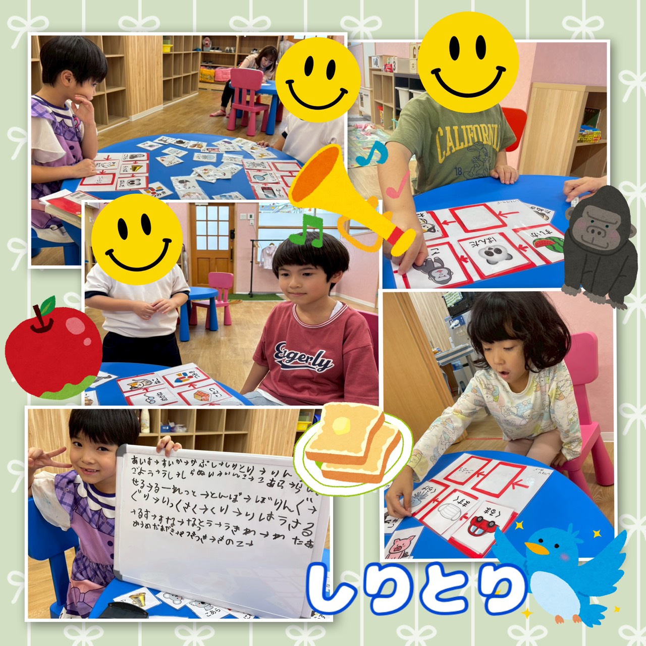 しりとりをホワイトボード⬜️に書いていき、5分間でいくつ言えるかな?をやりました。字が書ける子に書いてもらいました。少し戸惑いながらも楽しんで字の勉強にもなってました。りはーさる。るーれっと等、普段使わない様な言葉も出てきて感心しました。「る」から始まる言葉は大人でもなかなか思いつかないのではないでしょうか?
