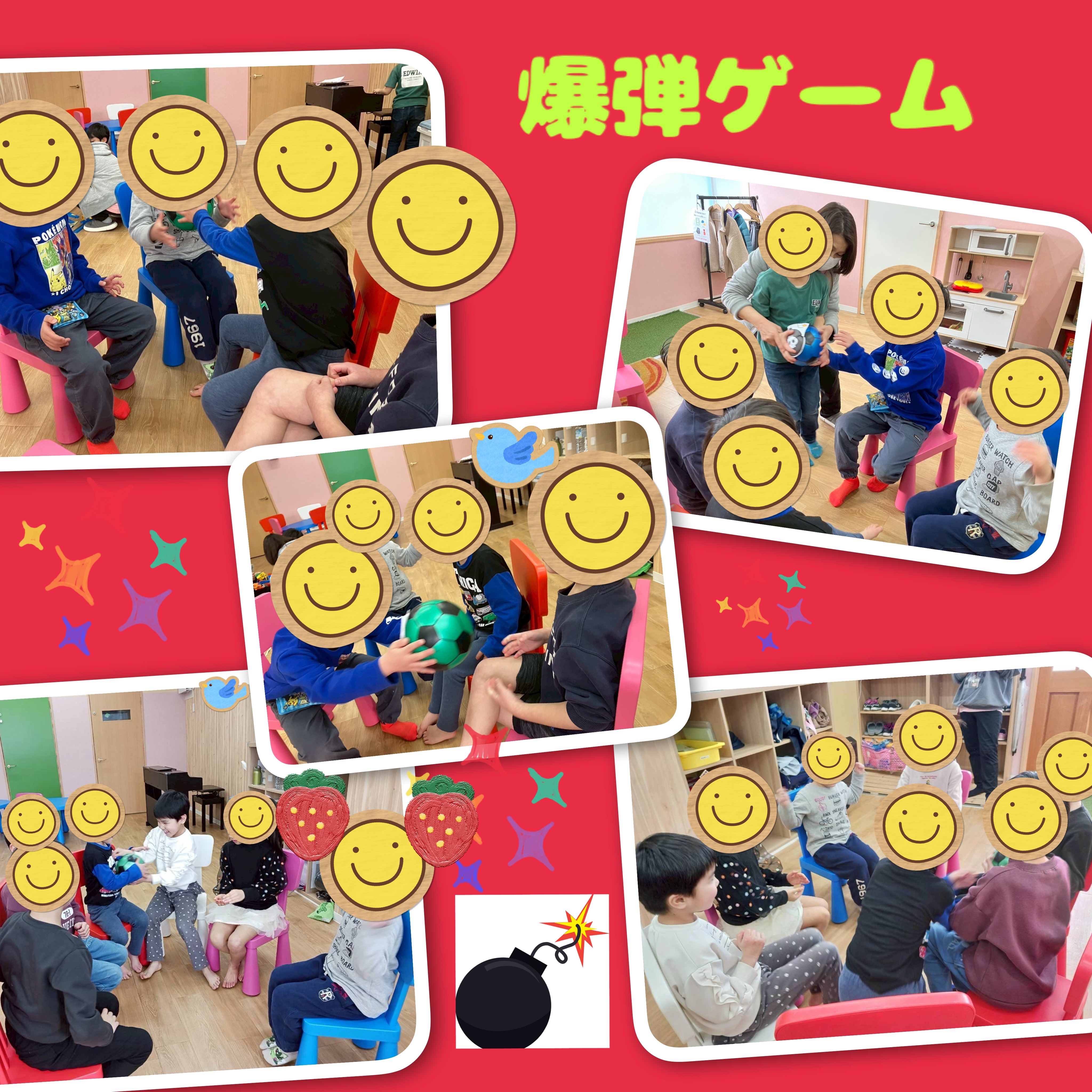 椅子🪑に座って輪になり、爆弾💣に見立てたボール🔵をアンパンマン、アイドル、働く細胞など、子ども達のリクエスト曲🎶をかけ、流れている間、隣のお友達に渡していきます。曲が止まった時に爆弾💣を持っていたら‥「ドッカーン💥」で罰ゲーム!スタッフの「好きな◯◯は何ですか?」の質問に答えます。中にはひ・み・つ!と答えてる子どももいましたよ!