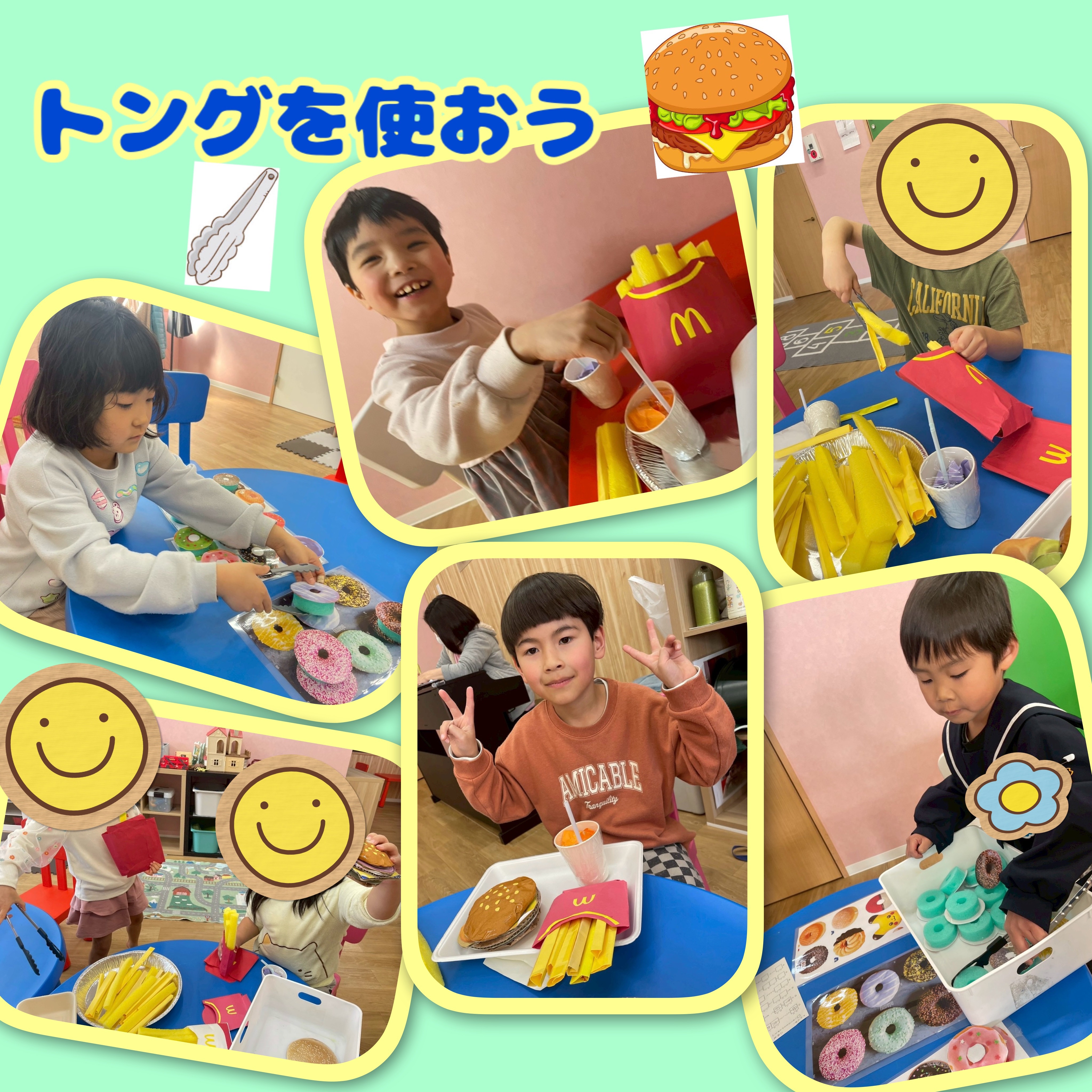 マクドナルドのハンバーガー🍔や、ポテト🍟、ミスタードーナツ🍩に見立てたカラフルな沢山のドーナツをトングで掴んで移動させたり、袋詰めしました。飲み物のリクエストがあり、急きょスタッフが用意すると大喜び!トレイに並べてセットメニューの出来上がり!👏店員さんの様に対応してくれる子どもたちでした😊