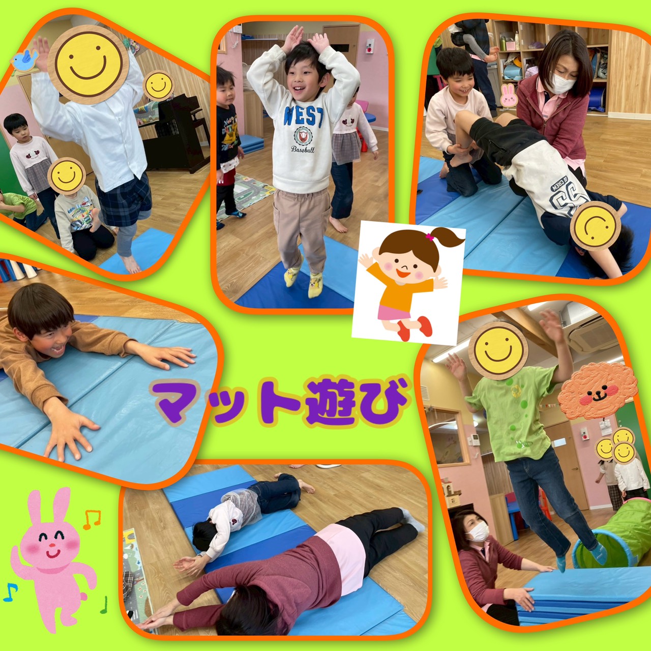 アラーム🕙がなると、お片付け→整列してやる気満々!マット🟦の上で横になりゴロゴロしたり、うさぎピョンピョン🐇、ニョロニョロヘビ🐍、スキップ、前まわりをしました。最後に子ども達が大好きなトンネルくぐり‥出たらマットの上からジャーンプ‼️とてもいい笑顔でした😆
