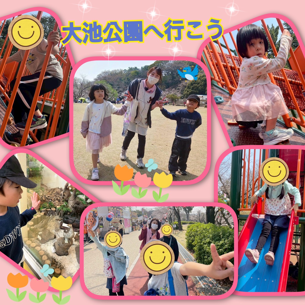 風もなく穏やかないい天気☀️で、公園日和。東海市にある公園に行って来ました。桜🌸も咲いていて、大きな池もありました。公園内は広く、屋台も並んでいて、「美味しそう〜」と言い横目👀で見ながら歩きました。公園に到着すると遊具をよじ登り、上から手を振ったり👋、滑り台🛝をしたりと楽しそう♪(๑ᴖ◡ᴖ๑)♪でした。小動物🦆🦌もいましたよ。帰り道で「楽しかった〜」「もっと遊びたかった!」と言っていましたが、切り替えやグループ行動もしっかりできていた子ども達です👏